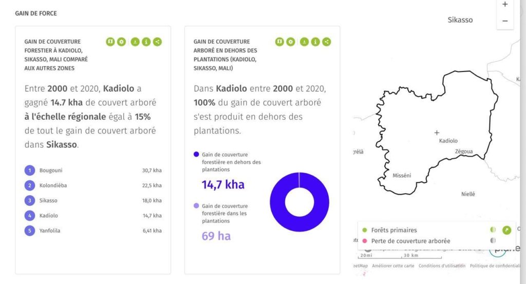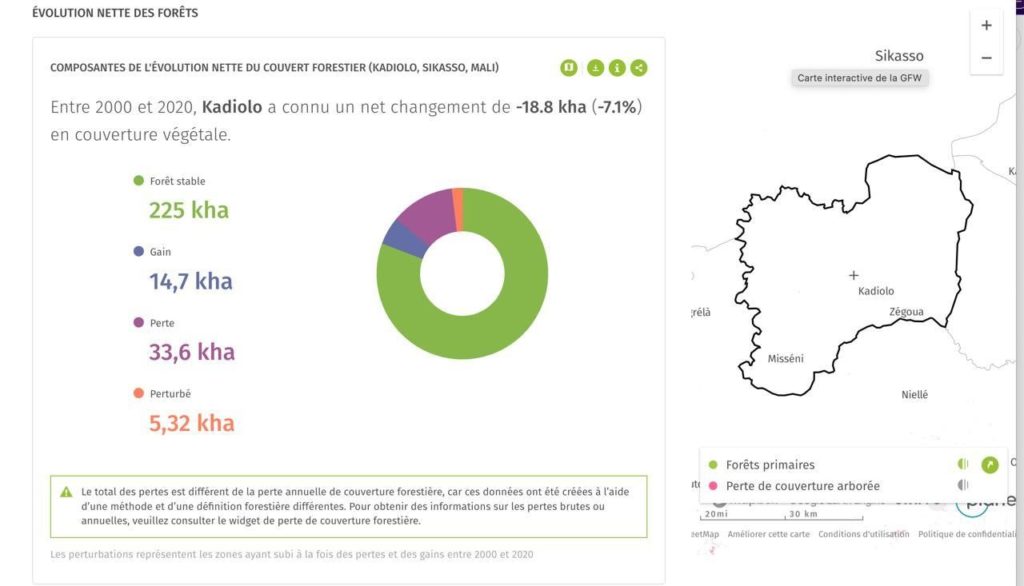 Les données sur la déforestation dans le cercle de Kadiolo proviennent de la plateforme de surveillance des forêtsGlobal Forest Watch, en collaboration avec l’Université du Maryland. Ces chiffres, y compris la perte de 18 800 hectares entre 2000 et 2020, sont calculés à partir de l’analyse d’imagerie satellite et sont disponibles sur le tableau de bord en ligne de Global Forest Watch.
